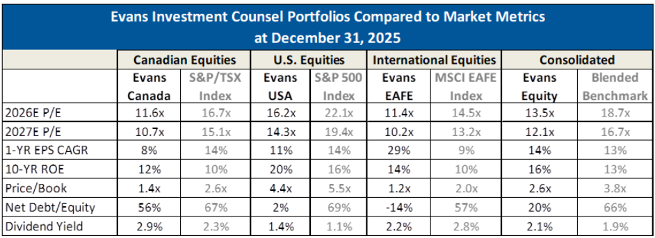 That nuance matters when we talk about “value.” Traditional definitions of value investing may evolve, and yesterday’s metrics may not always fully explain tomorrow’s winners. But some principles remain the same. Paying a reasonable price for a great business with strong economics, reinvestment opportunities, and capable management has consistently been a reliable way to grow wealth over time. That philosophy does not guarantee a win every single year, but it does help investors reach long-term financial goals with fewer unpleasant surprises along the way. The chart below shows how we aim to accomplish this goal for our clients. It compares some key metrics of the companies we hold (under “Evans Equity”) to those of our blended benchmark. Yes, markets may be expensive today, but on average our investments are cheaper (lower price/earnings ratio or “P/E”), more profitable (greater 10-year return on equity, shortened to “ROE”) and less indebted (lower net debt/equity) than our benchmark.